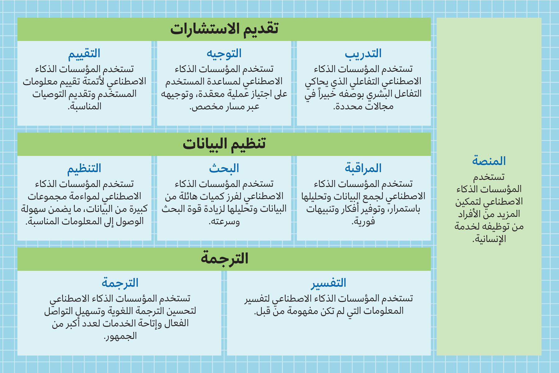 - التفسير: تستخدم المؤسسات الذكاء الاصطناعي لتفسير المعلومات التي لم تكن مفهومة من قبل. فالتحدث إلى الحيوانات، مثلاً، يبدو وكأنه قدرة لن نحصل عليها إلا بالأحلام. ولكن يمكن للآلة التقاط معلومات وأنماط لا يمكن للبشر التقاطها. على سبيل المثال، يستخدم مشروع إيرث سبيشيز بروجكت (Earth Species Project) التعلّم العميق لتصور التمثيلات الدلالية للغة لإتاحة التواصل مع الأنواع الأخرى.