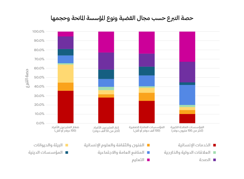 ومع ذلك، تشير التحليلات الدقيقة والمفصلة إلى أن هذا النمط العام كان مدفوعاً إلى حد كبير بحجم المانح؛ فكان المانحون الصغار، سواء الأفراد أو المؤسسات، ميالين إلى التبرع لمؤسسات الخدمات الإنسانية، في حين كان المانحون الكبار، الأفراد منهم والمؤسسات، ميالين إلى التبرع للمؤسسات غير الربحية في قطاعي الصحة والتعليم.