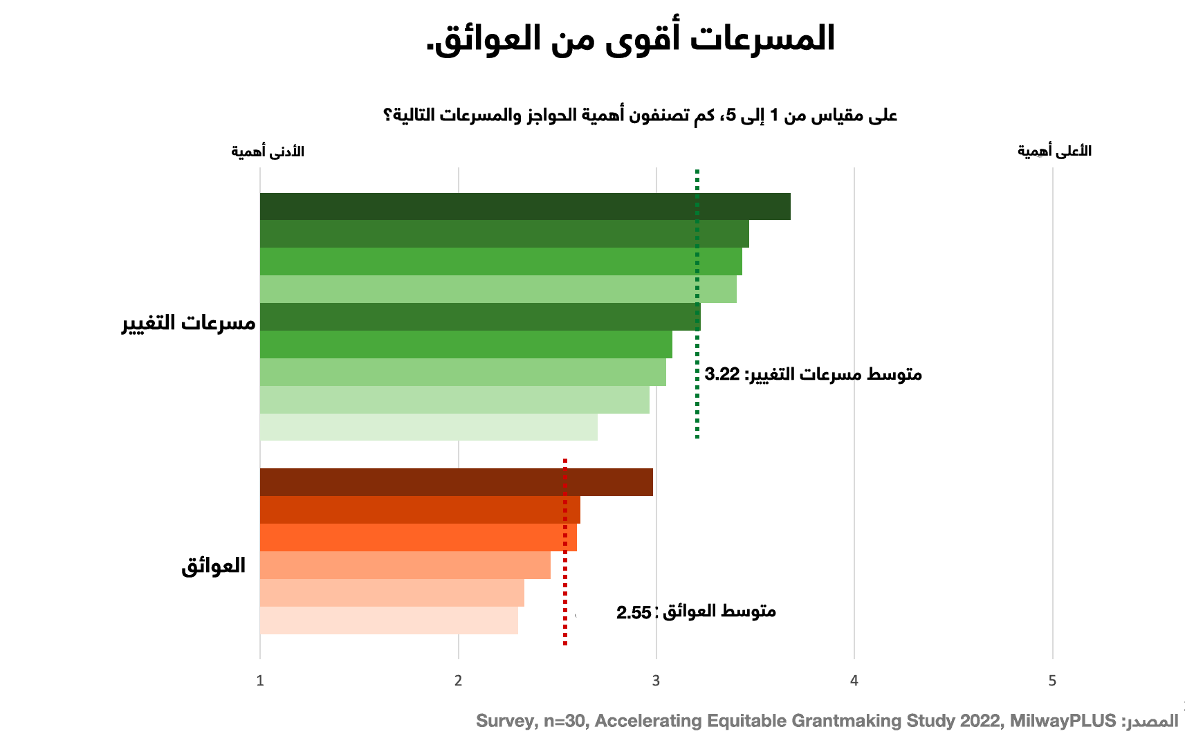 في الواقع، انخفضت نسبة العائقين الرئيسيين (دورات الميزانية، تحيز الأمناء إلى التحكم) عندما تبنت مجالس الإدارة ما وجدته دراستنا أنه مسرع التغيير الأول: أن تحرص مجالس الإدارة على "توضيح القيم" وارتباطها باستراتيجيات تحقيق التغيير. كما أدت قوى التغيير الإيجابية إلى تلاشي 3 عوائق رئيسية أخرى: اختلال توازن القوى بين الجهة المانحة والمستفيدين من المنح، ومعتقدات الممول حول المساءلة، وأساليب الممولين البيروقراطية.