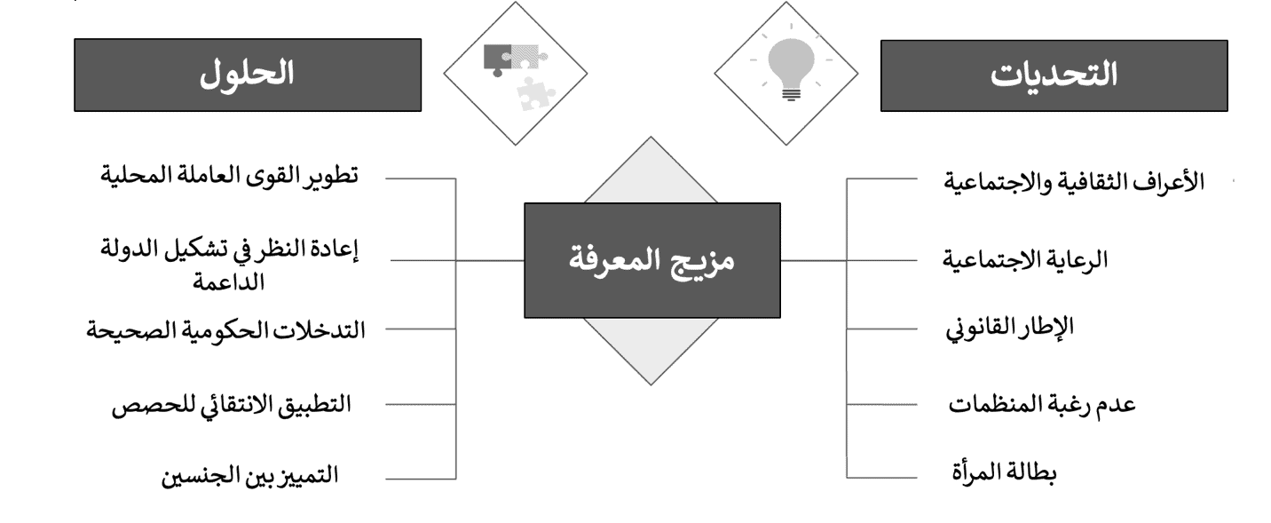 أشارت الأبحاث المتعلقة بنظام الكوتا إلى أسباباً مختلفة لعدم فعالية هذا النظام، والتي تعددت بين رفض المؤسسات له بسبب ارتفاع تكاليفه الاقتصادية، وعدم التقيد به عندما لا تفي القوى العاملة المحلية بمتطلبات الوظيفة، وقدرة بعض المؤسسات على التهرب من النظام أو التحايل على أهدافه. وسنلقي نظرة على كل من هذه التحديات المحتملة لصانعي السياسات والحلول اللازمة للتغلب عليها كما هو موضح في الشكل أدناه.