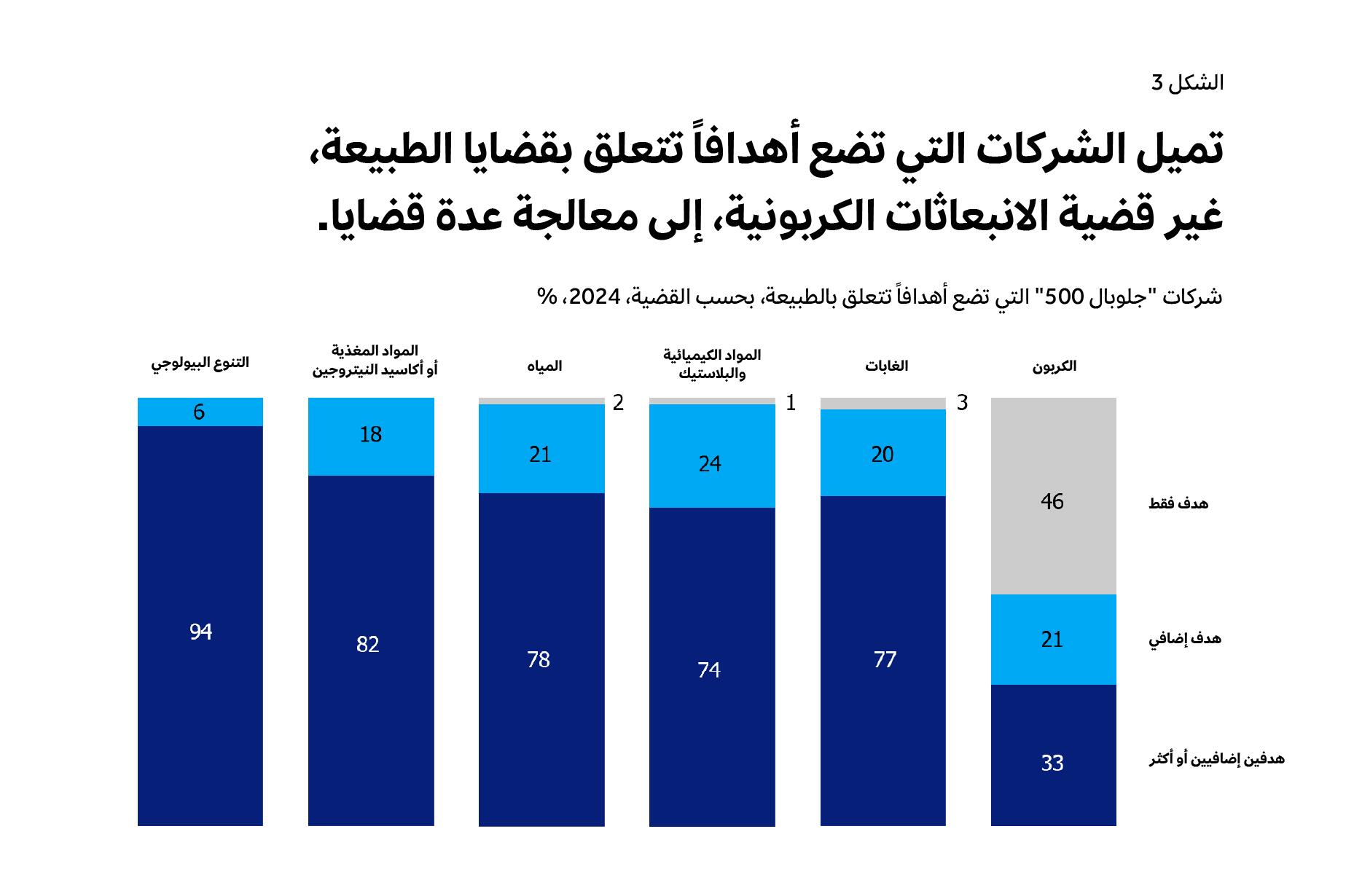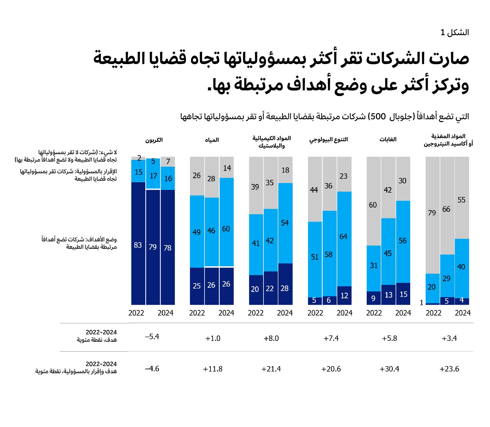 بالمقارنة مع عام 2023، ازداد عدد شركات قائمة "جلوبال 500" التي تولي أهمية لمختلف قضايا الطبيعة بخلاف قضية الانبعاثات الكربونية، حيث وضعت أهدافاً ثابتة للحفاظ على الطبيعة أو استعادتها أو اعترفت بأهمية الطبيعة بوصفها جزءاً من استراتيجية أعمالها (الشكل 1).