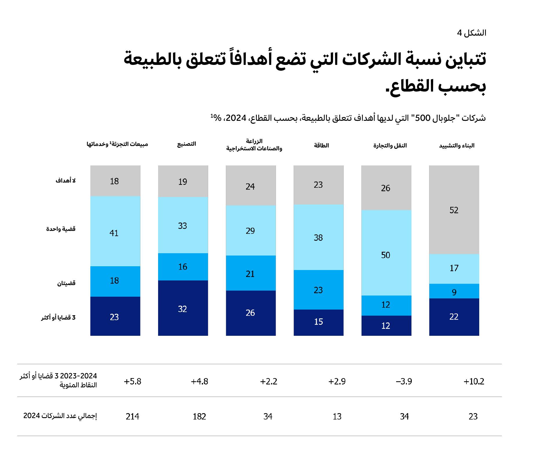 لا تزال شركات قطاع التصنيع تتضمن أكبر نسبة من الشركات التي تضع 3 أهداف تتعلق بالطبيعة أو أكثر. ومع ذلك، أظهر قطاعان آخران، وهما البناء والتشييد ومبيعات التجزئة وخدماتها، أكبر نمو في هذه الفئة، مع زيادة بأكثر من 10 نقاط مئوية ونحو 6 نقاط مئوية، على التوالي (الشكل 4).