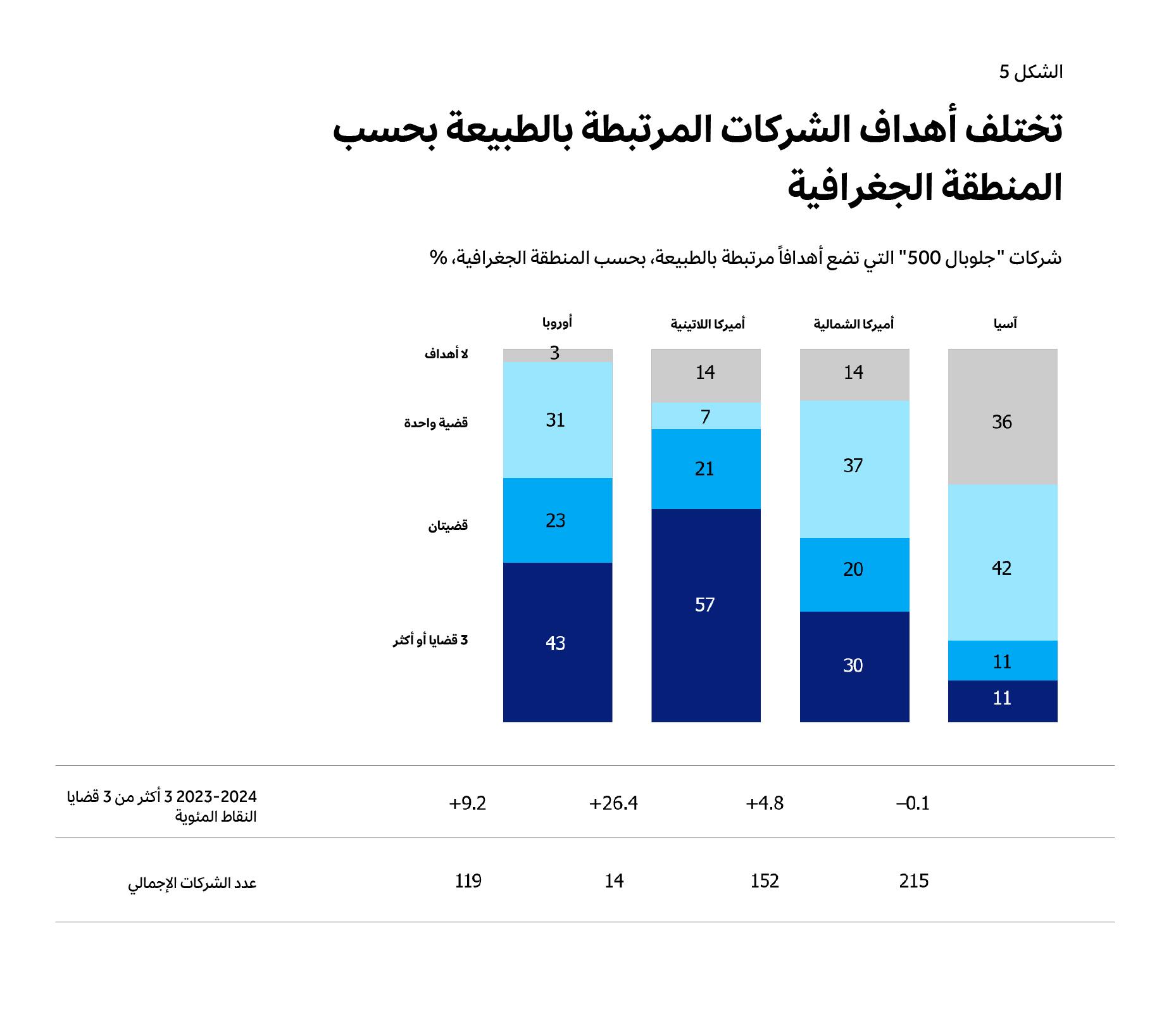 تحظى شركات أميركا اللاتينية بأعلى نسبة ضمن الشركات التي تحدد ثلاثة أهداف أو أكثر، في حين تستمر شركات أوروبا في الصدارة من حيث تحديد الأهداف عموماً.