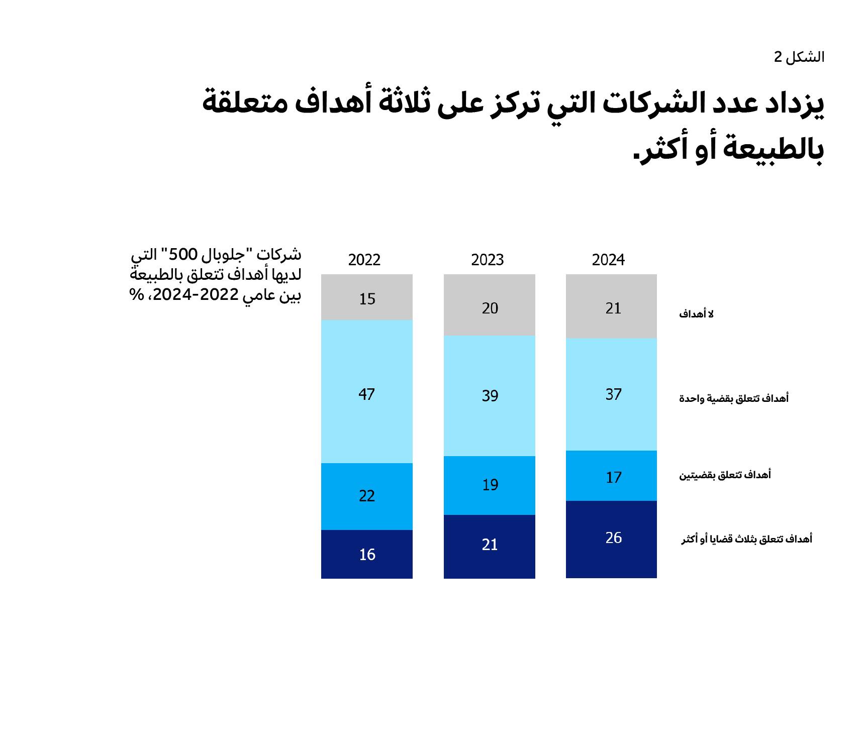ارتفعت نسبة الشركات التي لديها ثلاثة أهداف متعلقة بقضايا الطبيعة، أو أكثر، إلى 26% في عام 2024، مقارنة بـ 16% عندما بدأنا التتبع أول مرة عام 2022 (الشكل 2). في حين أن نسبة الشركات التي ليست لديها التزامات تجاه الطبيعة لم تتغير كثيراً، يبدو أن نسبة الشركات التي وضعت أهدافاً في السابق توسع التزاماتها وتطورها لتشمل مزيداً من قضايا الطبيعة.