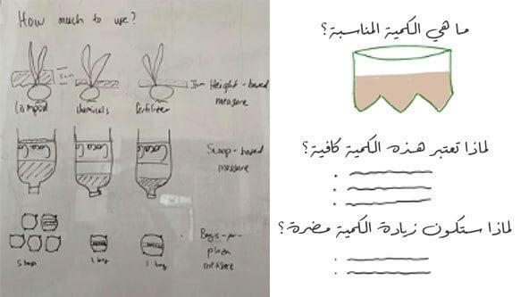 يعمل الطلاب في معهد هاسو بلاتنر للتصميم على إنشاء عدة اتجاهات للحلّ ويجمعون التقييمات طوال فترة المشروع من الشركاء والمستخدمين النهائيين، ما يزيد احتمالات أن تكون الحلول الناتجة مفيدة وفي محلها. توضح هذه الرسوم التخطيطية التقريبية الحاجة إلى استخدام أساليب القياس التي يتبعها سكان المنطقة بصورة يومية بالفعل، قالت واحدة من أعضاء الفريق، ماتيلدا نيكل، وهي طالبة في السنة الأخيرة بقسم علم النفس بجامعة ستانفورد: "لاحظنا في بحثنا تفاوتاً كبيراً في الأرقام، إذ كانت كمية السماد التي يوصي بها المرشدون مختلفة جداً عن الكمية التي يستخدمها المزارعون بالفعل. عندئذ فكرنا: لِم لا نستخدم وحدات القياس التي يستخدمها المزارعون بالفعل؟" تحولت الصور التوضيحية المعروضة أعلاه إلى "قوائم مراجعة" شهرية تتيح للمزارعين تتبع الكميات التي يستخدمونها من السماد وفق وحدات القياس التي يعرفونها؛ "الحفنة" (ملء كف اليد)، و"الإبريق"، و"الكيس":