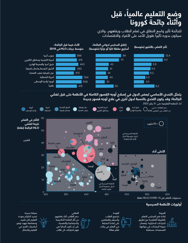 تفاوتت مدة إغلاق المدارس على نطاق واسع في جميع أنحاء العالم. فقد أغلقت المنشآت المدرسية في دول أميركا اللاتينية وجنوب آسيا ذات الدخل المتوسط كلياً أو جزئياً لمدة كانت الأطول؛ بلغت 75 أسبوعاً أو أكثر. وأغلقت المدارس في دول أوروبا وآسيا الوسطى ذات الدخل المرتفع كلياً أو جزئياً لمدة أقل بلغت 30 أسبوعاً في المتوسط، بينما كانت مدة الإغلاق في دول إفريقيا جنوب الصحراء ذات الدخل المنخفض 34 أسبوعاً في المتوسط.