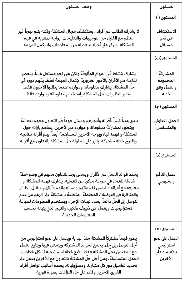 يوضح الجدول أن المبتدئين يعملون على نحو مستقل لأنهم لا يدركون فوائد التعاون مع أقرانهم، وبالنتيجة لا يتوصلون إلى حلّ للمشكلات المعنية، ولكن مع ازدياد كفاءة الطلاب سيصبح تعاونهم مع الآخرين أكبر وسيصبح بإمكانهم تحقيق فوائد العمل التعاوني بصورة تدريجية. يعتمد خبراء حلّ المشكلات التعاوني على أقرانهم، إذ يطورون فهماً مشتركاً للمشكلة ويعملون على نحو استراتيجي لحلها ويحرصون على حلّ النزاعات في كل خطوة.