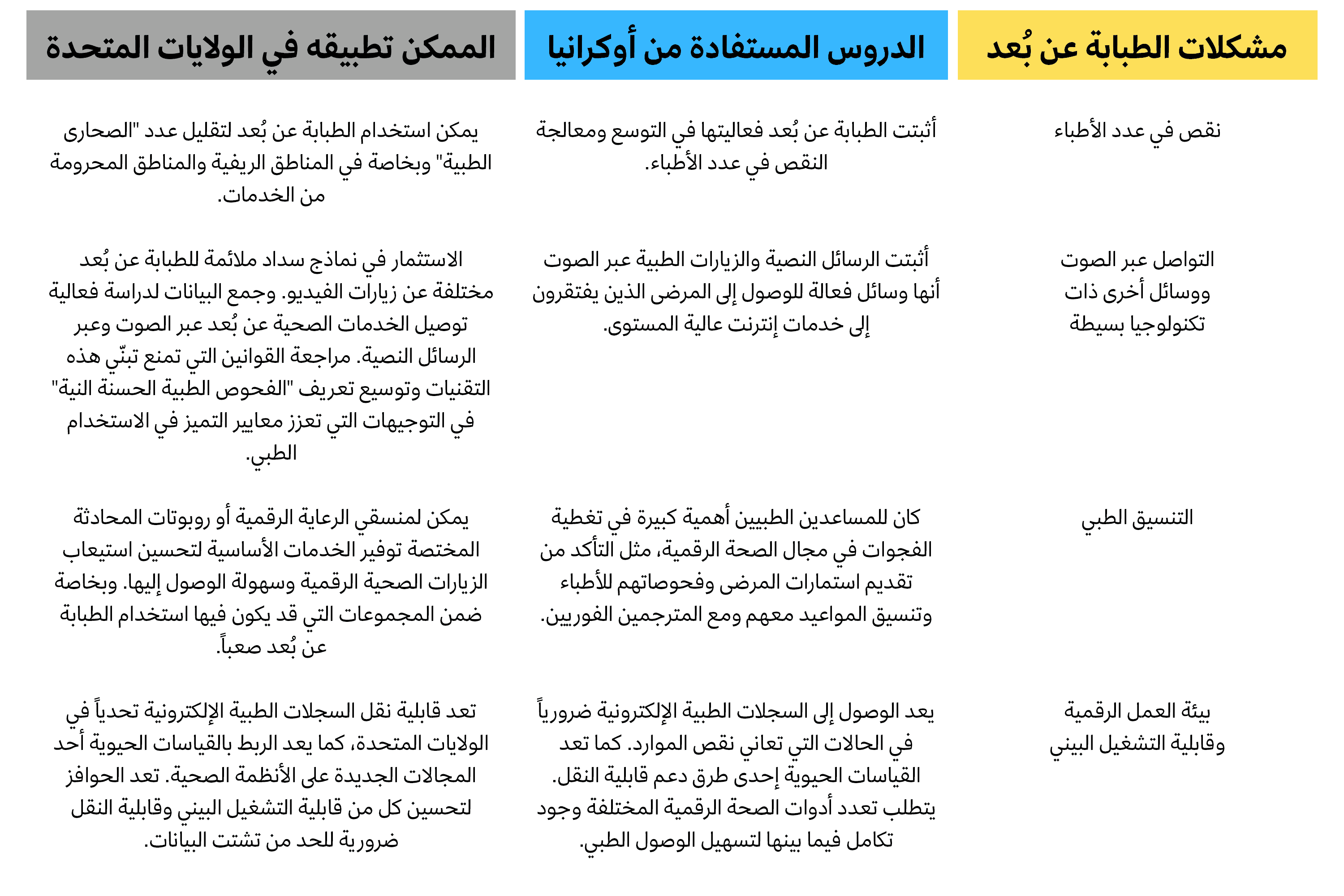 في المقابل، بلغ استخدام الطبابة عن بعد في الولايات المتحدة ذروته خلال الموجة الأولى من جائحة كوفيد-19 في أبريل 2020، حيث أجريت 69% من زيارات الأطباء عن بُعد. وانخفض استخدام الطبابة عن بعد بشكل ملحوظ منذ ذلك الحين. بذلت المؤسسات الصحية جهوداً جبارة في بناء البنية التحتية للخدمات الصحية الرقمية، لكنها ما تزال في طور التعلم لكيفية الاستفادة من هذه التكنولوجيا لمعالجة مشكلة انخفاض الوصول إلى الخدمات الصحية في المجتمعات المحرومة.